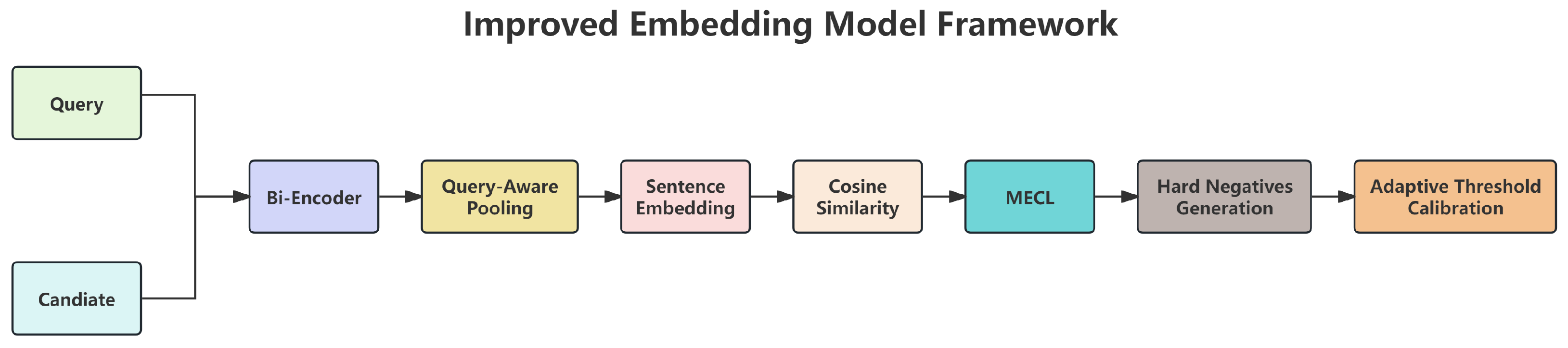 To enhance the semantic matching capability in automotive fault question–answer retrieval, this study proposes a novel embedding model, QASE (Query-Aware Semantic Embedding). The model is built on a dual-tower bi-encoder architecture and incorporates multiple innovations to improve the discriminative power of semantic representations and the robustness of the model.