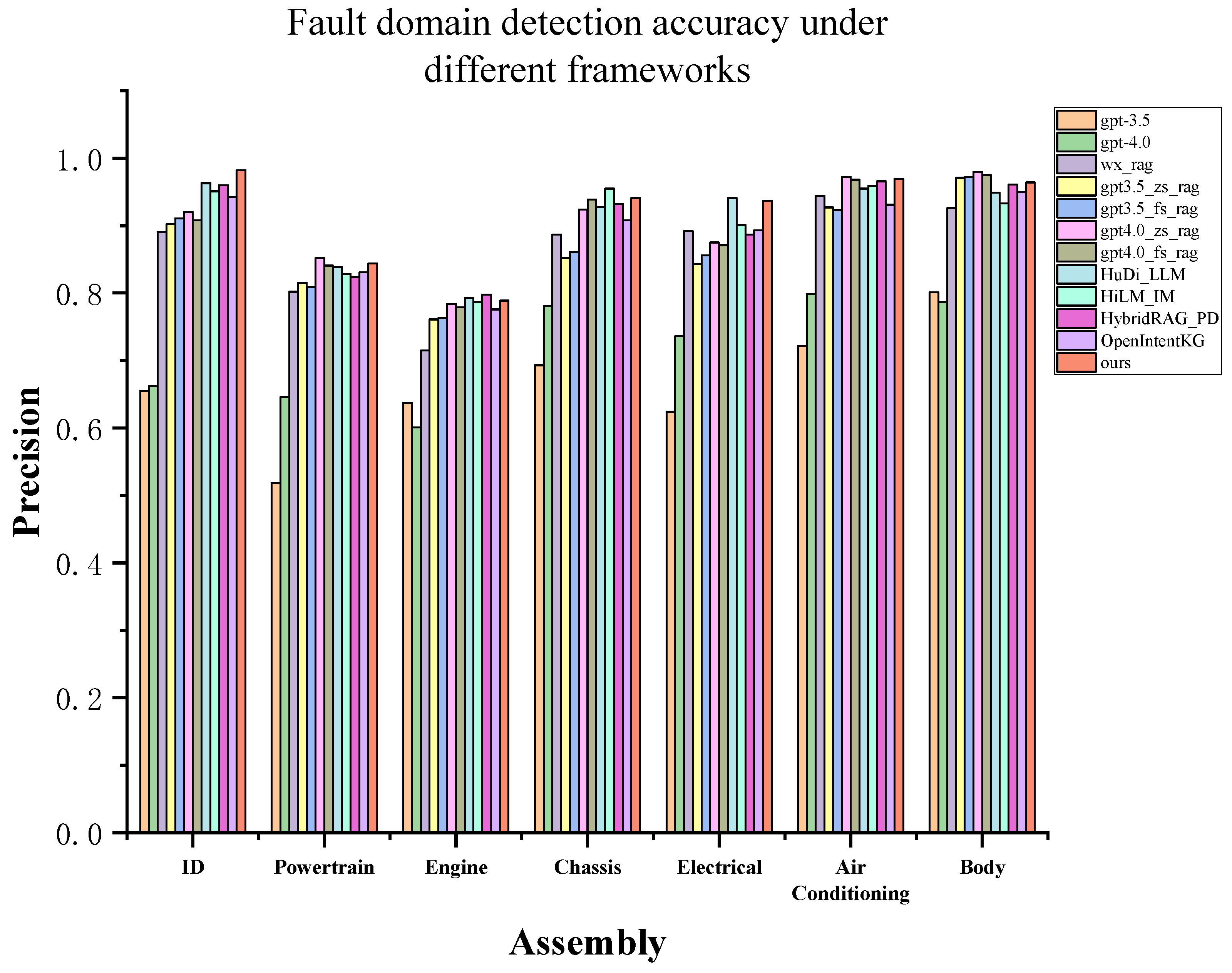 Figure 6, we compare the fault domain detection accuracy of different frameworks for various components in automotive fault diagnosis. The experimental results show that there are certain differences in fault detection accuracy across frameworks, which may influence the subsequent information inquiry paths and diagnostic decisions. In some cases, relying solely on pre-trained models may fail to accurately identify fault patterns based on natural language descriptions, leading to faults that should belong to different components being incorrectly classified under the same component. However, under the frameworks based on RAG or knowledge graphs, the fault domain detection accuracy was improved.