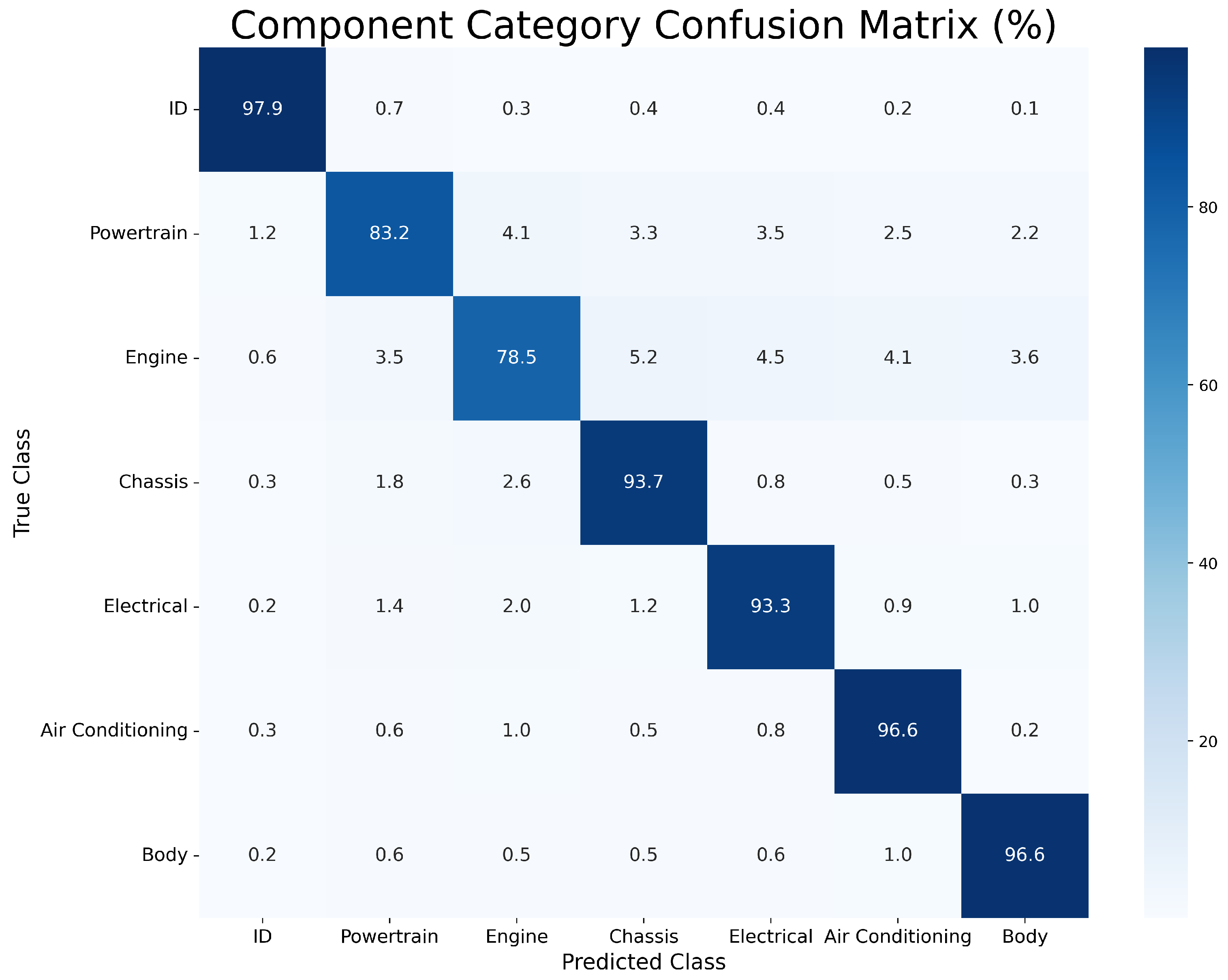 Additionally, we observed that, regardless of the detection framework used, the fault domain detection accuracy for the powertrain component and the engine component consistently remained at a lower level compared to the other major components. We hypothesize that this may be due to the more complex structure of these two components and the fact that their fault manifestations share more similarities with faults from other components, making it more challenging for the model to learn, which ultimately results in lower detection accuracy compared to the other components.