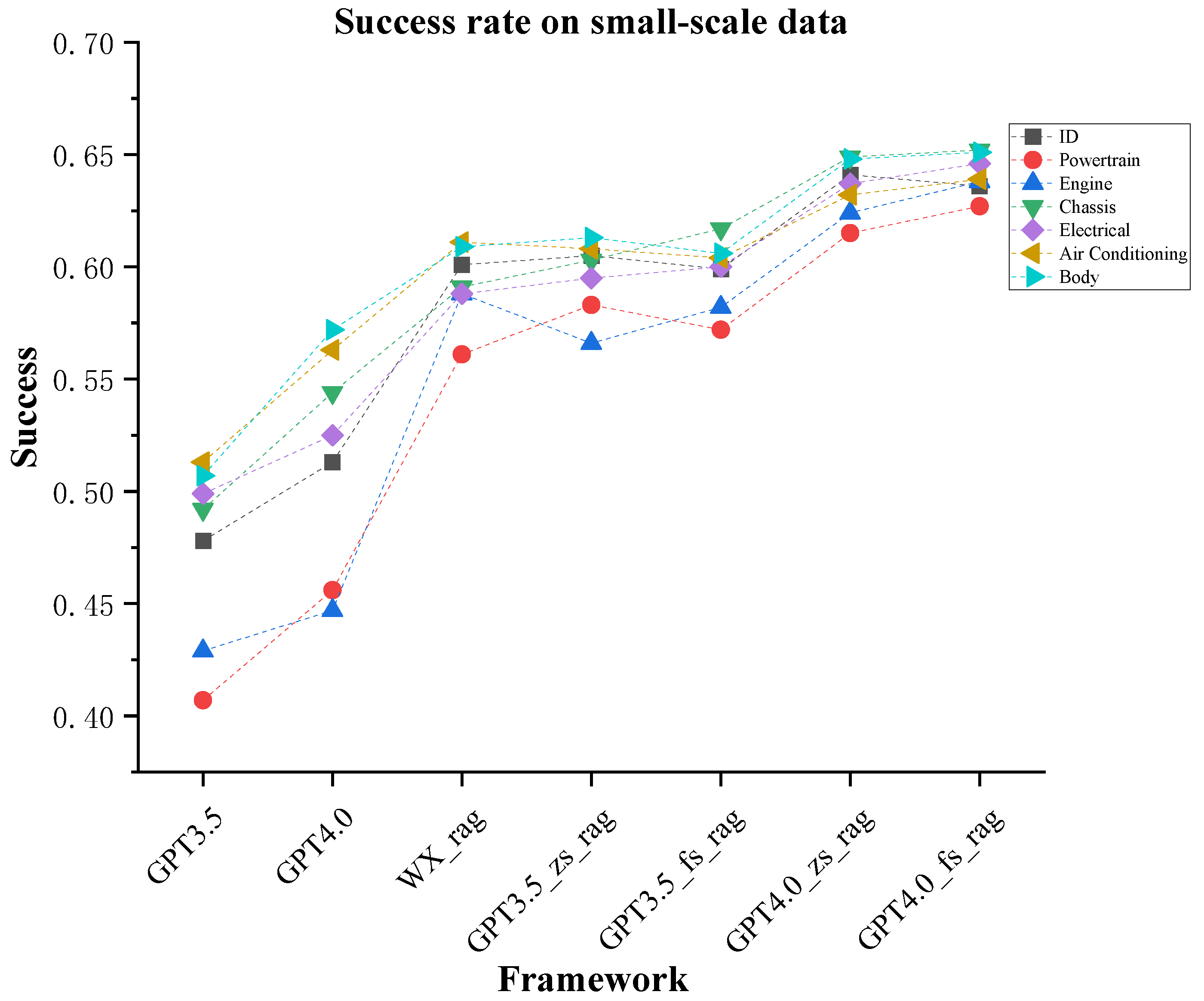 Figure 8, on smaller-scale datasets (such as individual components), simpler frameworks can achieve good results through customized prompts. While our framework uses fewer examples in the prompts, we can adapt strategies from these simpler frameworks by increasing the number of examples in the prompts for more specific tasks to improve performance. However, our work focuses more on enhancing the generalization across overall automotive repair scenarios rather than optimizing for a single component. On large-scale datasets, excessively long prompts may be counterproductive and hinder the improvement of cross-component generalization abilities.