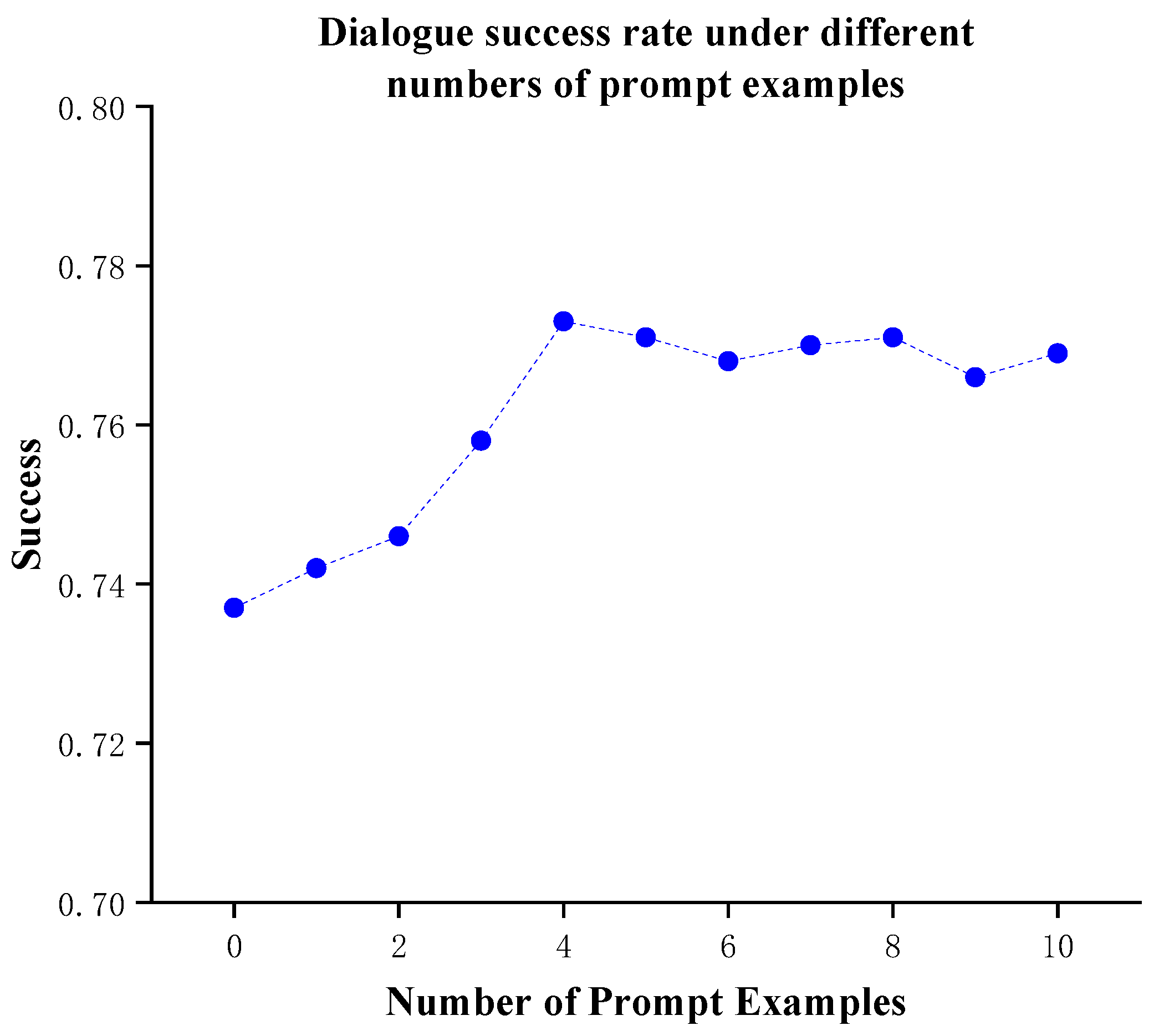 We also investigated the impact of the number of examples in prompts on dialogue success rates. In our framework, prompts with examples are mainly applied to the information extraction and update process. The results, shown in