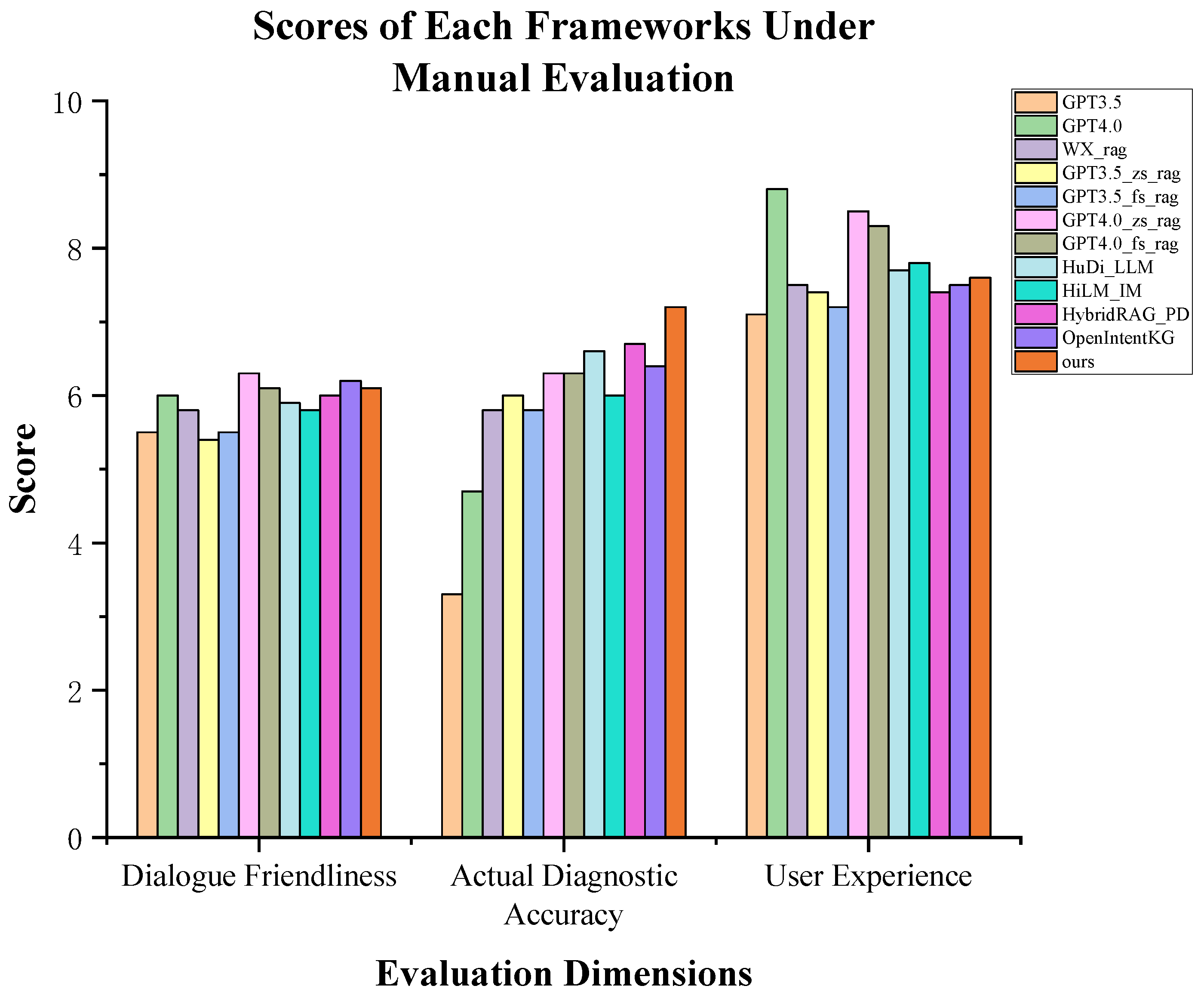 Table 5. It can be observed that the overall scores for these two metrics are relatively low. For pre-trained models, the lower diagnostic accuracy directly affects the generation quality, resulting in lower BLEU and ROUGE-L scores. In traditional frameworks combining large models with RAG, the responses from the large model are usually more verbose. Although the diagnostic accuracy is generally average, the shorter penalty factor improves the scores slightly. However, in our framework, due to the higher diagnostic accuracy, the generated responses are more semantically aligned with the reference answers, leading to relatively higher BLEU and ROUGE-L scores. That said, due to the existence of multiple valid response options in dialogue, the use of a single-reference text limits the upper bounds of these metrics.