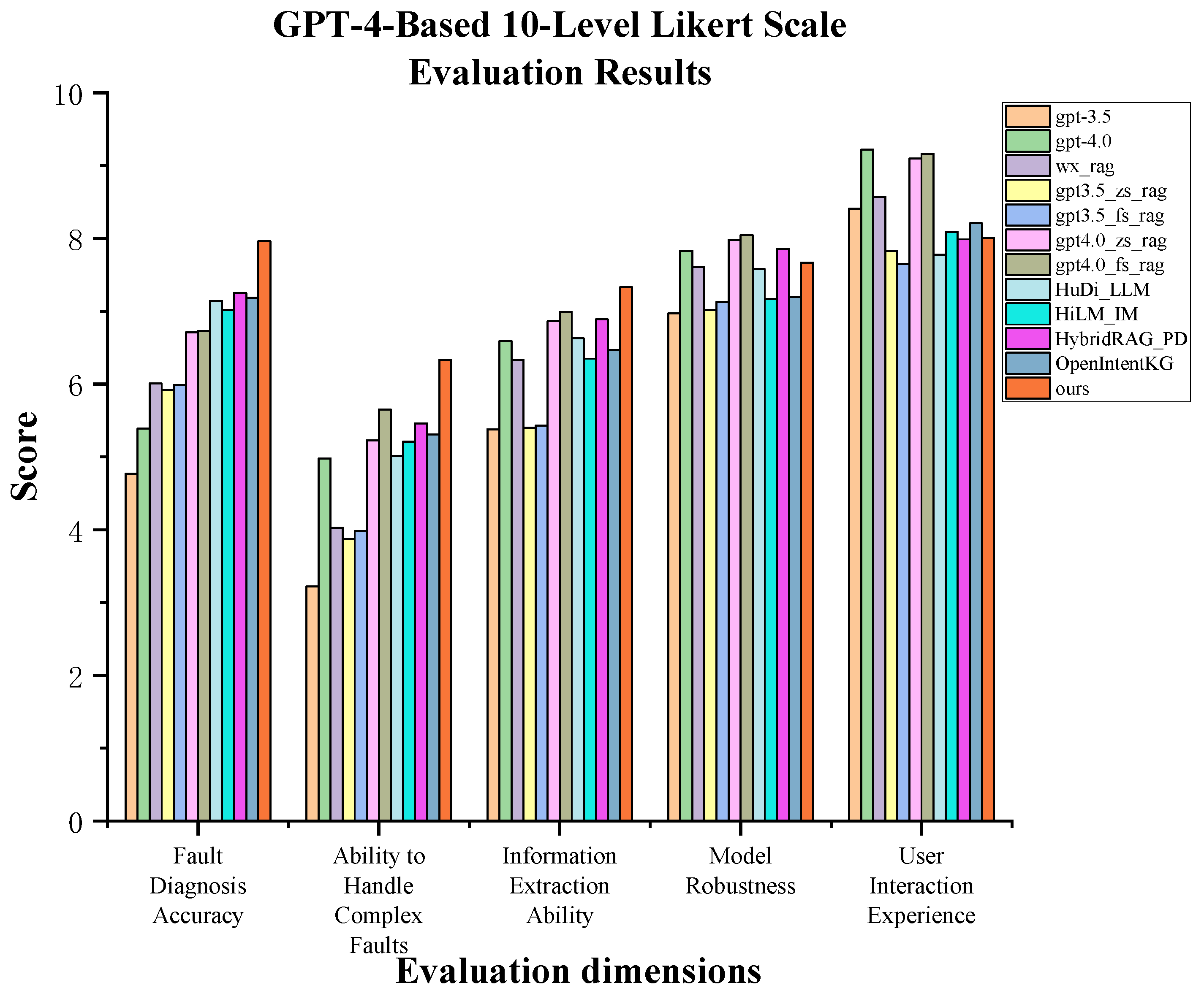 46] that the evaluation results of large language models are highly consistent with human evaluations and exhibit strong stability. Therefore, we introduced GPT-4.0 for framework comparison evaluation. We designed a 10-point Likert scale and used the GPT-4-0125-Preview model to evaluate each framework across several dimensions, including fault diagnosis accuracy, complex fault handling ability, information extraction capability, model robustness, and user interaction experience, with scores ranging from 1 to 10 for each dimension. The evaluation results are shown in