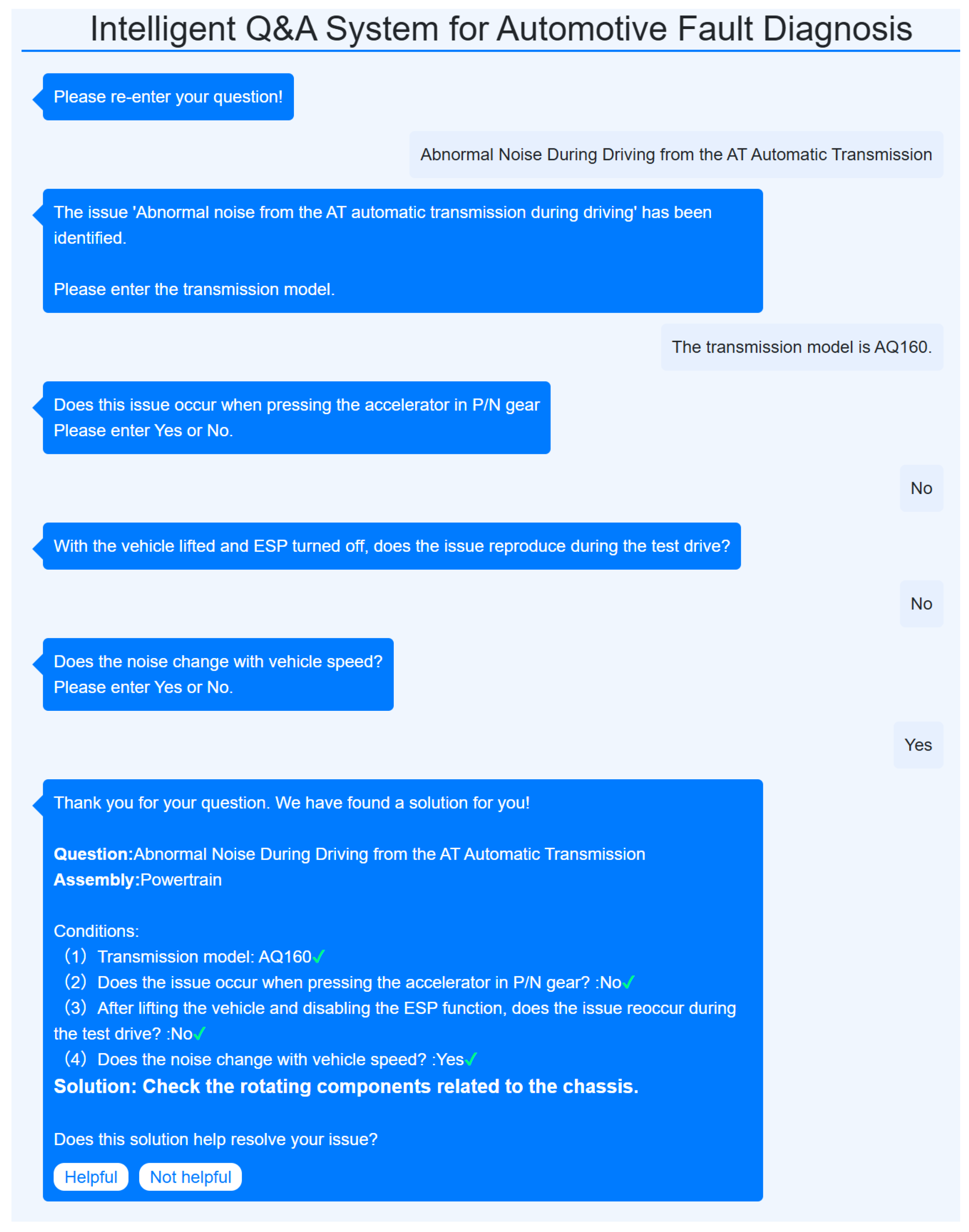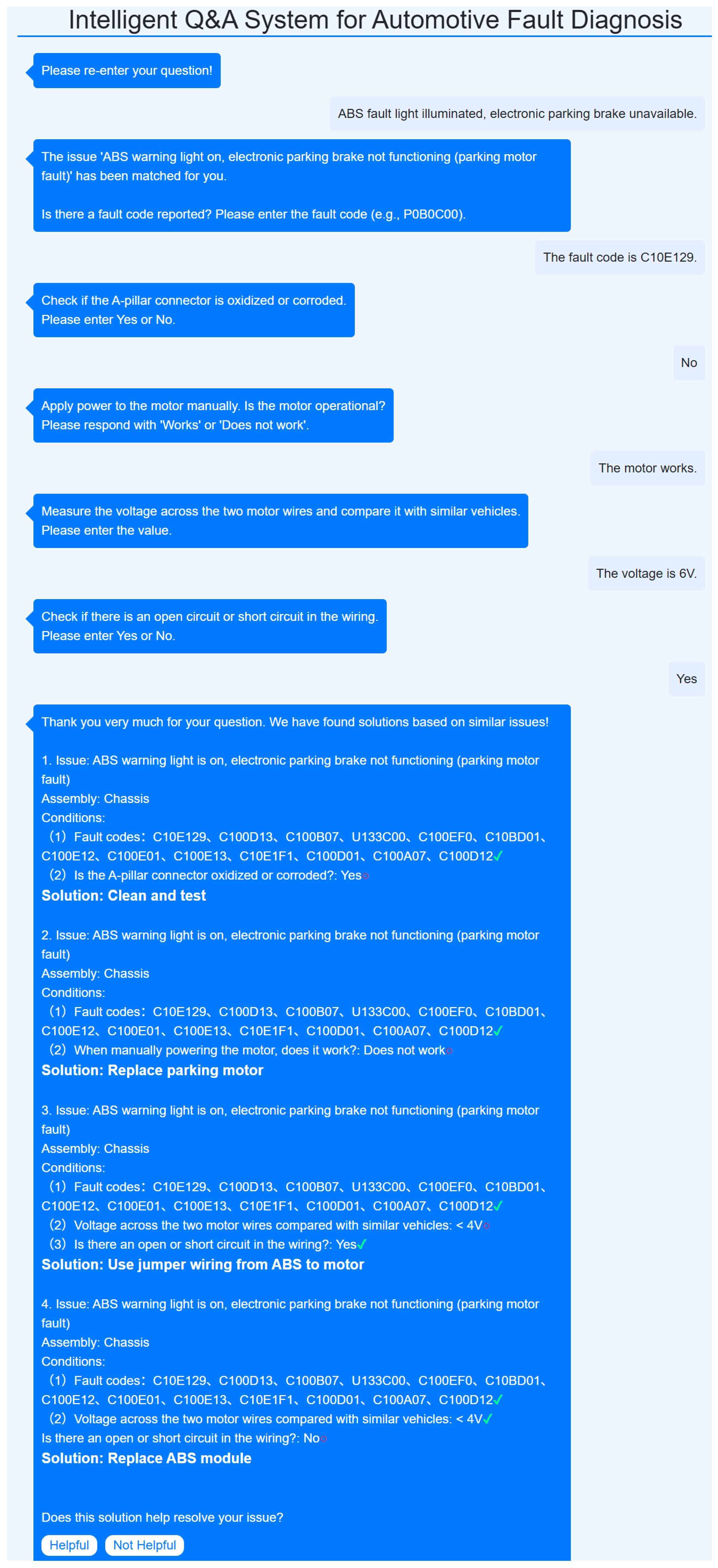 Knowledge Graph Coverage Gap: Some fault scenarios are not sufficiently represented in the knowledge graph due to the limited number of related cases, leading to incomplete or inaccurate diagnostic results. For instance, the issue where the instrument cluster occasionally displays a message indicating that the lane-keeping assistance system is temporarily unavailable occurs very rarely. As a result, the corresponding solution in the knowledge graph is incomplete. When encountering such issues, the system typically suggests restarting the vehicle’s system; however, a simple restart may not necessarily resolve the problem, as a software version update might also be required.