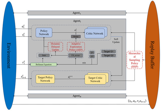 To achieve coordinated optimization of policy exploration, sample utilization, and policy updating, this study introduces a multi-agent co-evolution algorithm named MATD3_AHD, which integrates three enhanced strategies—AEP, HSP, and DDU—into the MATD3 framework. The overall schematic is illustrated in Figure 1. The algorithmic workflow includes the initialization of each agent’s actor and critic network parameters, target network parameters, replay buffer, and the hyperparameters required by the AEP, HSP, and DDU. During each training episode, the process includes adaptive modulation of exploration noise according to the AEP mechanism. Furthermore, diverse and high-quality experiences are sampled from the replay buffer using HSP, and the policy update frequency is regulated according to the TD error through the DDU. This iterative process continuously optimizes the agents’ policies and enhances their collaborative decision-making capability. Our three modules co-evolve through a shared TD error-driven feedback loop. HSP reshapes the replay distribution using cluster TD errors; this changes critic loss and, thus, the TD error, which, in turn, drives the AEP to adapt exploration noise (Equation (7)) and the DDU to adjust the actor update frequency via a TD error threshold. The updated policy then generates new trajectories that refresh the buffer and priorities, closing the loop and making the modules adapt jointly rather than independently.