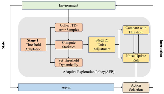 In multi-agent reinforcement learning, fixed-level exploration noise may lead to inefficient policy learning and make it difficult to adapt to the dynamic changes in policy stability during training. To address this issue, this paper proposes a two-phase AEP, which adjusts the noise intensity based on the dynamic variation of the TD error, thereby enabling more efficient policy exploration and exploitation. The overall structure of the proposed strategy is illustrated in Figure 2, which is divided into two phases: