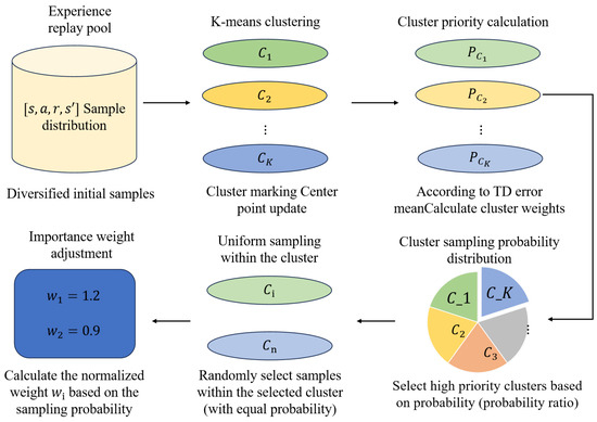 After selecting a cluster, experiences are further sampled within the cluster. To ensure diversity in sampling, uniform sampling is adopted within each cluster, meaning that each experience in a given cluster has an equal probability of being selected. Specifically, let cluster contain experiences; then, the sampling probability of experience within cluster is expressed as follows:
