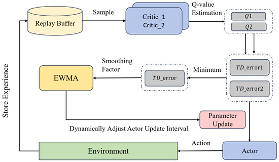 By evaluating the TD error to reflect the estimation error of the critic network, we adjust the update interval of the actor network accordingly. When the TD-error is large, indicating that the Q-value estimates are unreliable, more critic updates are needed before updating the actor. Hence, the actor update should be delayed to avoid optimizing the policy based on unstable Q-values. Conversely, when the TD-error is small, indicating accurate Q-value estimates, the actor can be updated more frequently, thereby accelerating policy optimization and improving training efficiency. The schematic diagram is shown in Figure 4.