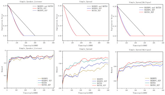 Table 6 reports the average maximum cumulative rewards after convergence across the three environments. The data are collected by averaging the maximum returns over the last 10,000 episodes. Compared with MATD3, MATD3_AEP improves the average reward by 3%, 2%, and 5% in the Simple_Speaker_Listener, Simple_Spread, and Simple_Spread_Multigoal environments, respectively. Similarly, MADDPG_AEP achieves average reward improvements of 5% and 7% compared to MADDPG. Overall, the results show that MATD3_AEP consistently outperforms MATD3, while MADDPG_AEP also achieves higher performance than MADDPG, demonstrating the effectiveness of the AEP in enhancing exploration efficiency.