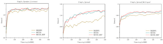 Table 7 presents the standard deviation of evaluation rewards post 10,000 episodes. MATD3_HSP consistently achieved the lowest reward variance in all environments. Compared with MATD3, the improvements in reward stability were approximately 4.7%, 3.4%, and 6.9%. Compared with MADDPG, the improvements were more pronounced at 16.0%, 21.7%, and 6.6%.