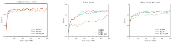 To verify that the DDU can enhance the agent’s capacity for processing environmental information and adaptively adjusting the update frequency of the actor network, we trained the MATD3_DDU algorithm and evaluated it in three MPE environments.