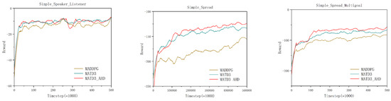 The reward curves of the MATD3_AHD algorithm and the baseline algorithms are illustrated in Figure 9. As observed from the analysis, MATD3_AHD achieves significantly improved reward performance compared to the other algorithms. Its reward curves show smaller fluctuations and more stable convergence. Although the algorithm experiences partial local optima in the Simple_Speaker_Listener environment, it does not affect the overall experimental conclusions. Moreover, MATD3_AHD reaches training stability using fewer time steps, demonstrating improvements in convergence speed, stability, and efficiency.