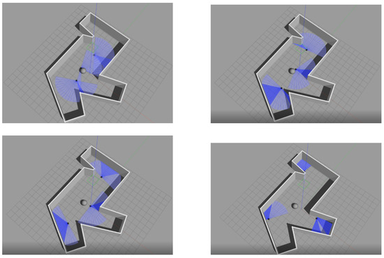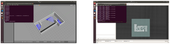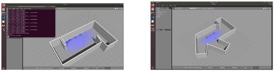 To validate the practical applicability of the proposed algorithm, a simulated environment was constructed based on ROS and Gazebo, utilizing the Turtlebot3 (Waffle) mobile robot platform. This setup was designed to evaluate the feasibility and efficiency of applying the multi-agent co-evolutionary algorithm in real-world-like multi-robot exploration tasks. The simulation involves three robots and three goals. The robots collaborate in real time through LiDAR and visual perception modules to perform coordinated path planning. The MATD3_AHD algorithm is employed for path regulation and coordination. As shown in Figure 10, the system successfully enables multi-robot coordination for both obstacle avoidance and goal reaching.