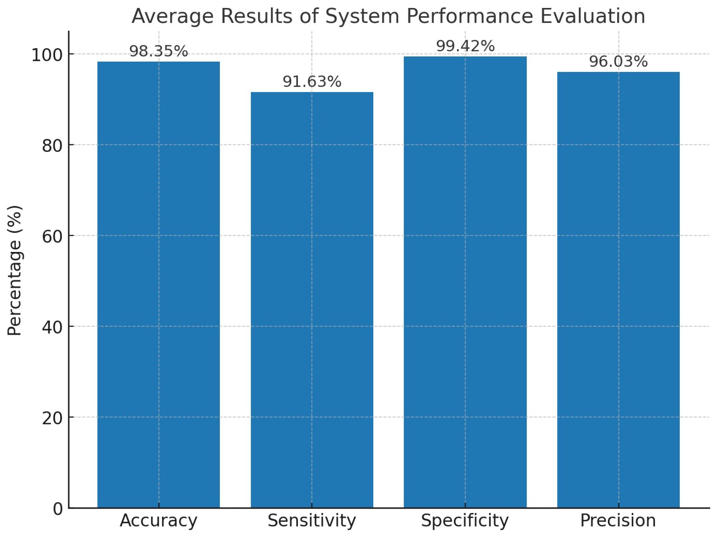 Quantitative performance evaluation further demonstrated the superiority of the proposed method. Compared to the conventional baseline, accuracy increased from 81.96% to 98.40%, and sensitivity from 76.36% to 91.68%. These substantial gains indicate that the incorporation of context-aware superpixel fusion and adaptive enhancement directly contributes to segmentation robustness. Although specificity and precision exhibited only moderate improvements, the overall balance across all metrics suggests that the proposed method achieves reliable identification without compromising false-positive control.