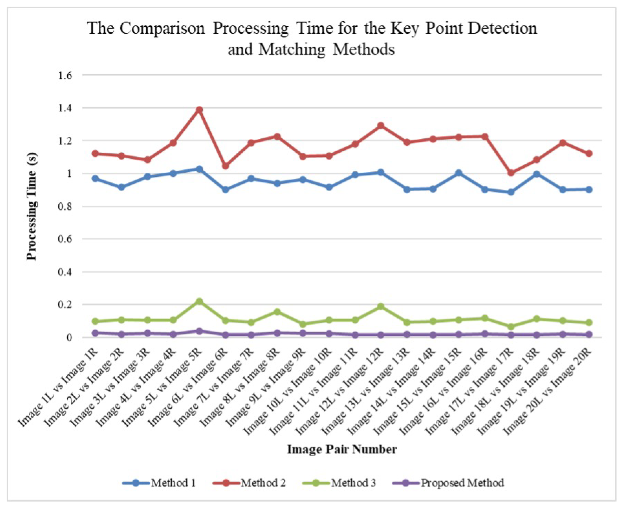 The computational efficiency of feature detection and matching was evaluated to verify the feasibility of the proposed framework for real-time PTLI monitoring. Four methods were compared in terms of processing time and stability. Method 1 integrates ROI tracking, optimized feature detection, binary feature description, and advanced matching [