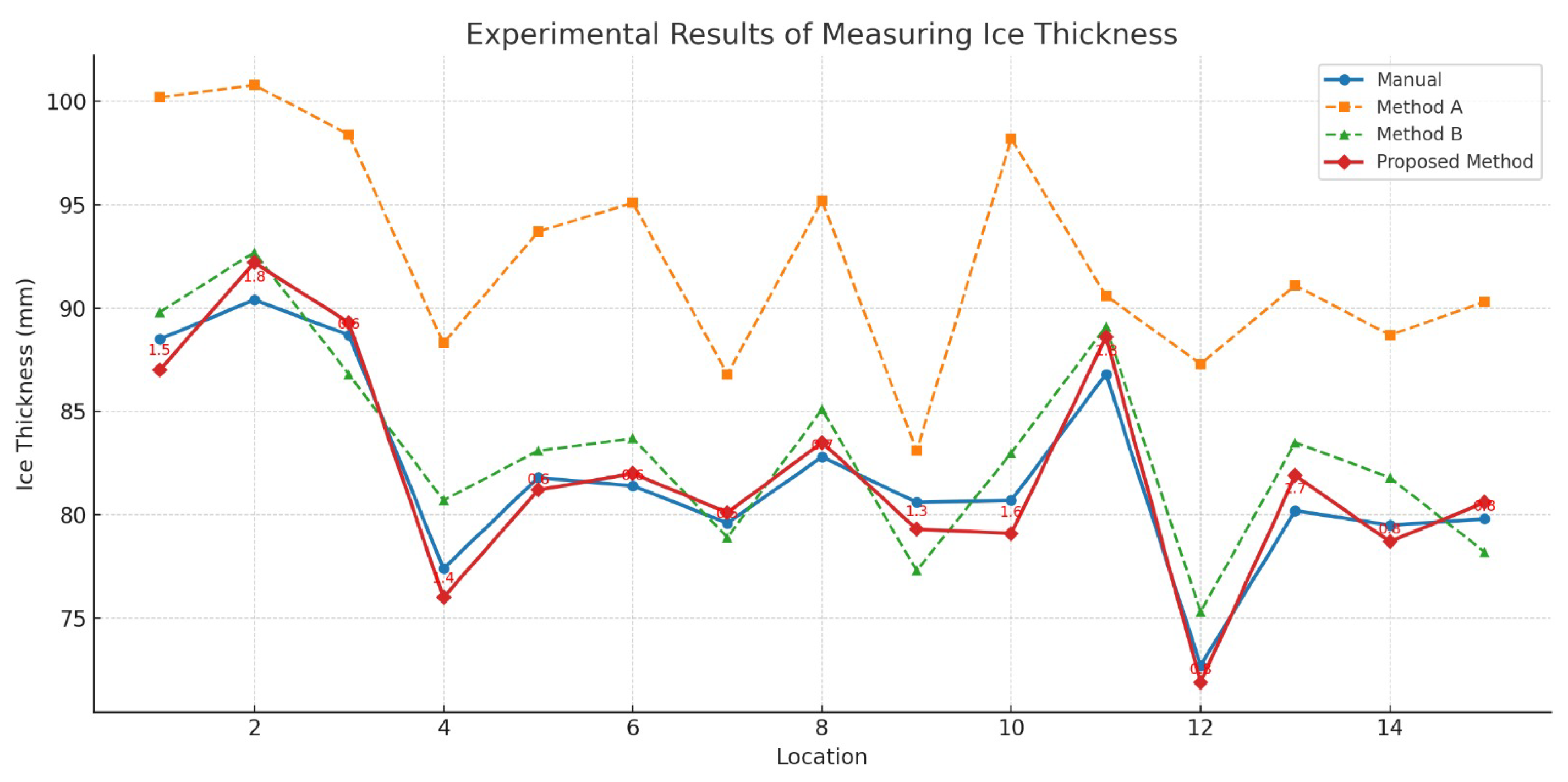Figure 13 illustrates a comparison graph of ice thickness measurements obtained by various methods (Manual Measurement, Method A, Method B, and Proposed Method) at 15 locations. Manual measurements were used as a reference benchmark.