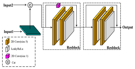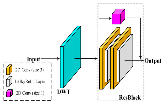 As illustrated in Figure 2, our designed down-sampling layer first processes the input through a wavelet down-sampling layer, which reduces data dimensions without information loss. Simultaneously, to prevent performance degradation caused by inefficient forward and backward information flow during training, we incorporate a residual block composed of “convolution, Leaky-ReLU layer, convolution, Leaky-ReLU layer”. As illustrated in Figure 3, the up-sampling layer is correspondingly configured with an inverse wavelet transform layer that mirrors the downsampling layer, along with the incorporation of two residual blocks. Where input2 represents the features to be fused from the upsampling module, while input1 denotes the features output by the previous module before this downsampling module. The wavelet transform is explained as follows: