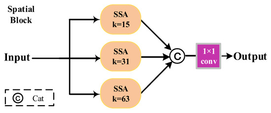 The Spatial attention primarily consists of three parallel Strip Attention (SSA) units. These employ simple convolutional branches to learn weights that aggregate contextual spatial information for each pixel from adjacent positions in the same row or column, achieving efficient information aggregation with low computational cost. Through horizontal and vertical strip attention operations [24], the module implicitly expands the network’s receptive field, enabling central pixels to perceive broader contextual regions and better capture long-range dependencies in the image.