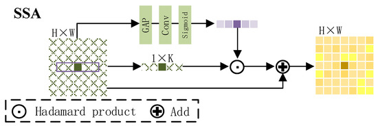 where W1×1 represents the 1 × 1 convolution, ‘’ denotes the Sigmoid function, and K defines the integration length of the horizontal strip. We further improve efficiency by sharing A across the channel dimension. The refined features are then obtained through convolutional integration, with the computation for each output element following Equation (3). The final output features are obtained by summing the original input features with the processed features, and by combining the three SSA outputs of identical size.