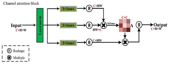 The channel attention block is illustrated in Figure 7. Specifically, tensors are obtained through layer normalization, followed by depthwise separable convolutions to generate projections for queries (Q), keys (K), and values (V). The query and key projections are reshaped so their dot product interaction produces a transposed attention map A of size C × C via Softmax. A is then multiplied with the value projection, and the result is processed through a 1 × 1 convolution before being added to the original features, yielding fused features of shape H × W × C. The T-LMM module enables the network to better capture and integrate important frequency components obtained from the Haar wavelet transform.
