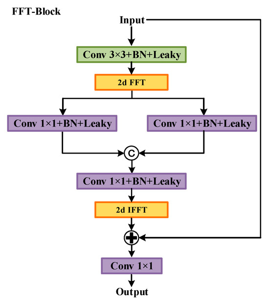 We designed a Fourier transform block as illustrated in Figure 8. This module comprises two parallel branches, specifically employing Fourier components to extract global information from images, globally updating spectral data in the frequency domain, and subsequently converting it back to the spatial domain. Through channel-wise two-dimensional fast Fourier transform applied to input X, the complex frequency domain representation is expressed as: