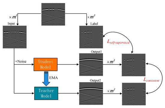 To address the challenges of effectively training neural networks under high missing rates and output instability caused by input noise, we incorporate the Mean Teacher Model [26] into this training framework. This semi-supervised learning approach employs a “teacher-student” dual-model structure, where the teacher model’s parameters are slowly updated via an exponential moving average (EMA) mechanism to produce more stable predictions. The student model simultaneously fits both the supervised signal (original seismic data) and the teacher model’s predictions, using consistency loss constraints to implicitly learn from unlabeled data (missing signals). This approach reduces dependence on large labeled datasets while enhancing model generalization through knowledge distillation from the teacher model-particularly valuable for label-scarce scenarios like seismic data interpolation.