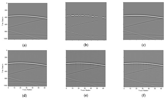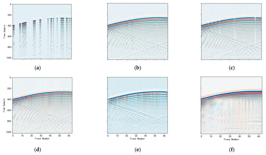 Actual experimental results: (a) Missing data; (b) Result from SC-Net; (c) Result from MWCNN; (d) Result from U-Net++; (e) Result from U-Resnet; (f) Result from CAE.