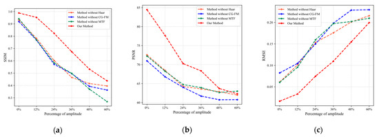 To provide a clear visual comparison of how different evaluation metrics vary under various noise conditions across ablation studies, the results are presented in Figure 12. It can be observed that our method consistently achieves the best overall performance across all metrics under different noise levels, even when Gaussian noise with 60% amplitude is added. The ablation variant without the CG-FM module demonstrates notably worse performance compared to the other two ablated configurations, underscoring the critical importance of the CG-FM module to our approach.