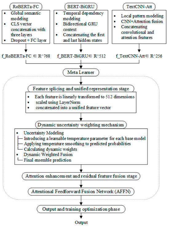 To fully leverage the multi-level representation capabilities of different deep learning models for text features and improve the accuracy and robustness of the sentiment analysis of reviews, this study designed a Meta Learner that integrates and adjusts the outputs of various base models using a dynamic uncertainty weighting mechanism. The core idea of this framework is to combine multiple complementary base learners to fuse their feature representations. Furthermore, during the prediction phase, the output probabilities of each model were dynamically weighted to reduce the impact of individual model bias and uncertainty on the final prediction results. This design mitigates the impact of individual model bias and uncertainty while highlighting stable models, thereby ensuring the reliability and generalization of the overall prediction.
