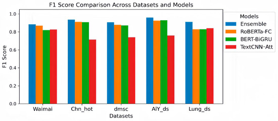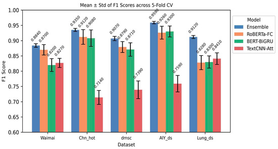 Figure 4, corresponding to Table 4, presents the mean F1 Score and within-fold standard deviation (STD) of the four models on each dataset in the form of a grouped bar chart. The figure clearly shows that the ensemble’s mean bar is higher than that of most base learners on all datasets, and its error bars are shorter, indicating that the model significantly reduces the within-fold fluctuation under K = 5-fold cross-validation, demonstrating high stability. Comparing the error bar lengths, the ensemble significantly reduced the within-fold uncertainty on all five datasets, validating the conclusion that “ensembling reduces within-fold fluctuation.” On the Waimai dataset, the mean of a single-base model (TextCNN-Att) is close to that of the ensemble, but the ensemble’s mean is still slightly higher and its variance is smaller, demonstrating that the ensemble strategy can provide robust gains even in everyday scenarios with direct emotional expression and brief text. On the Chn_hot dataset, the mean of the ensemble is significantly higher than that of the three-base model, and the error bars almost do not overlap, demonstrating that in complex, long texts, information-intensive corpora with multiple emotional transitions, the integration mechanism can fully integrate the complementary features of the base models to achieve maximum performance improvement.