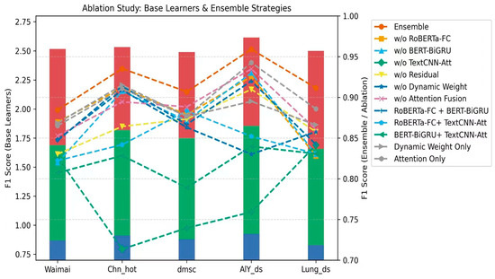 - Independent effects of dynamic weight and attention mechanism: To further distinguish the effects of the two mechanisms, the “Dynamic Weight Only” and “Attention Only” experiments were added: Dynamic Weight Only: Attention Fusion was removed, and only the temperature parameter was retained for dynamic weighting. The results showed that high F1 (0.8684, 0.9151, 0.8765, 0.8661) was maintained on the Waimai, Chn_hot, dmsc, and Lung_ds datasets, indicating that dynamic weighting can effectively adjust the weights of each base learner and has a suppressive effect on the interference of weak classifiers. However, the F1 on the AlY_ds dataset was 0.8950, slightly lower than Attention Only (0.9426), suggesting that dynamic weighting alone is not enough to fully exploit local complementary information on large-scale datasets with fully complementary features. Attention Only: Dynamic weighting was removed, and only Attention Fusion was retained. The results show that the F1 Scores on the AlY_ds and Lung_ds datasets are 0.9426 and 0.8858, respectively, both exceeding those of the Dynamic Weight Only approach. This demonstrates that the attention mechanism can enhance the local complementarity of feature fusion, improving the ability to model complex semantic structures or sentiment patterns in long texts. However, on the Waimai, Chn_hot, and dmsc datasets, the F1 Scores are 0.8651, 0.9106, and 0.8769, respectively, slightly lower than those of the Dynamic Weight Only approach. This suggests that attention alone is insufficient to ensure robustness when noise levels are high or weak classifiers are interfering.