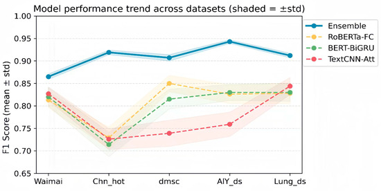 Figure 5 shows the performance trends of the models on different datasets using overlaid shading, with shading representing ±std. The analysis shows that the ensemble’s shading line consistently stays at the top and has a narrow shading band, indicating smoother and more stable performance across datasets. This not only supports the generalization advantage of ensemble methods for multi-source, multi-domain texts, but also reveals their robustness in the face of corpus differences. In particular, on the Chn_hot dataset, the vertical distance between the ensemble and the three-base model is the largest, intuitively reinforcing the phenomenon that ensembles yield the greatest benefits on complex, long texts. For short, everyday texts such as Waimai and dmsc, the shading lines are relatively close, indicating that the single-base model has achieved a good fit on these texts. However, the ensemble maintains its lead and has a smaller within-fold standard deviation, demonstrating that even with limited absolute improvement, its stability benefits are still significant.