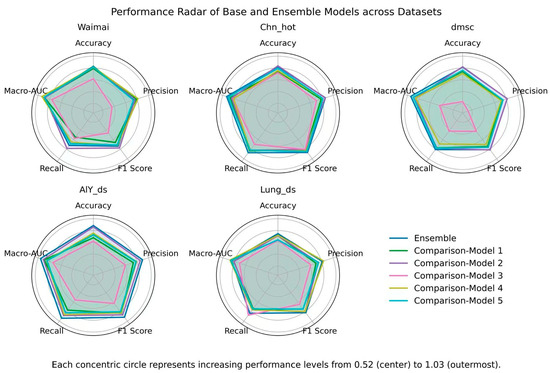 To comprehensively evaluate the adaptability and overall advantages of the proposed integrated model in tasks in different fields, this study drew a radar chart based on five core indicators (Accuracy, Precision, F1 Score, Recall, and Macro-AUC) on five datasets (Waimai, Chn_hot, dmsc, AlY_ds, and Lung_ds) (as shown in Figure 6) and calculated the cross-dataset mean of each indicator (as shown in Table 9).