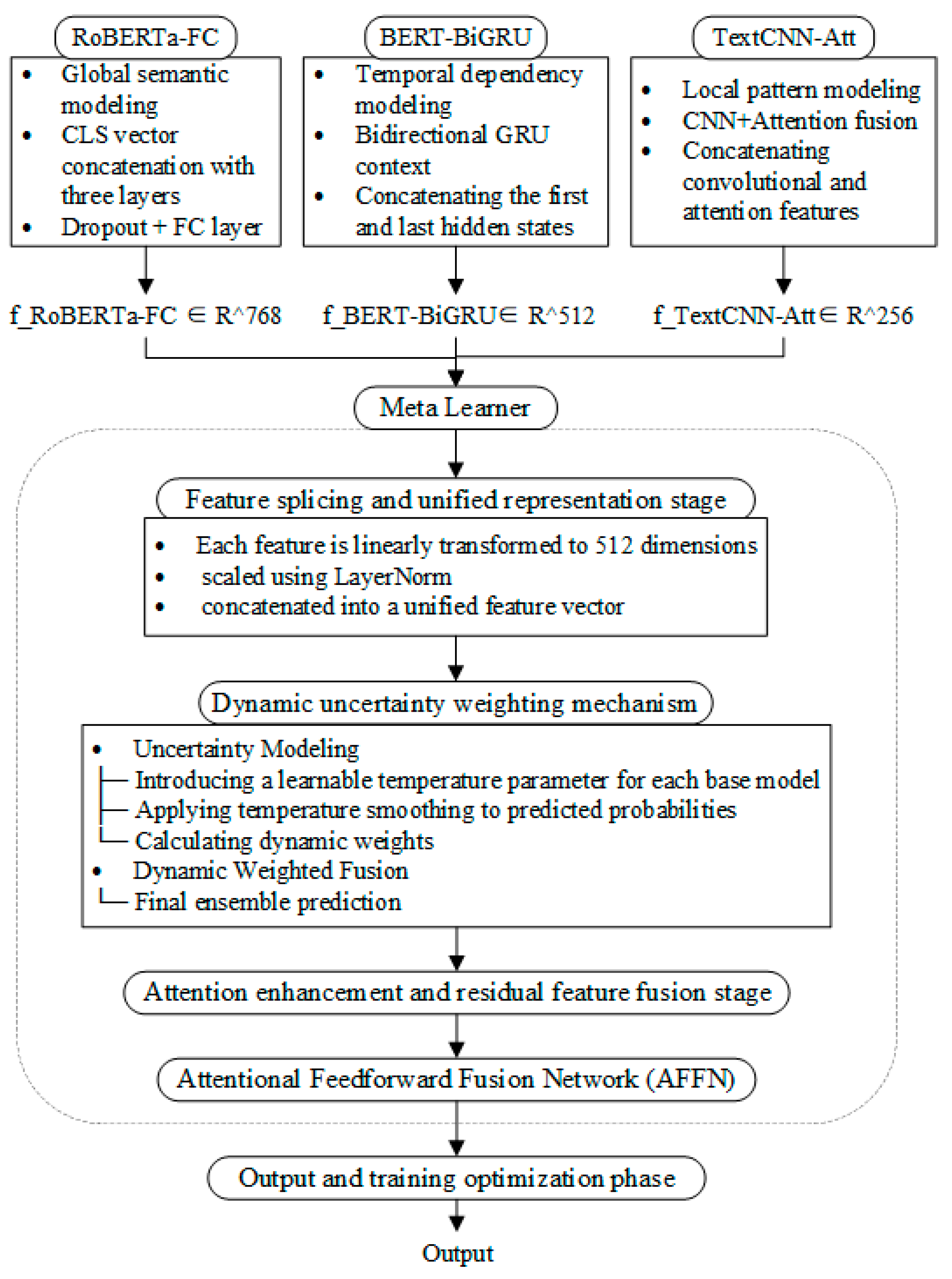 11]: In response to the limitations of traditional static word vectors (such as word2vec, GloVe) in semantic expression and the problem of insufficient generalization ability of single deep models, this method proposes a multi-base model framework based on BERT. First, the BERT pre-trained model is used to extract deep feature representations of text. Then, a heterogeneous classifier is constructed by combining multiple neural networks such as TextCNN, DPCNN, TextRNN, and TextRCNN. Finally, the stacking method is used to fuse them, and support vector machines (SVM) are used as meta-classifiers for training and prediction, thereby enhancing the adaptability and robustness of the model in different scenarios.