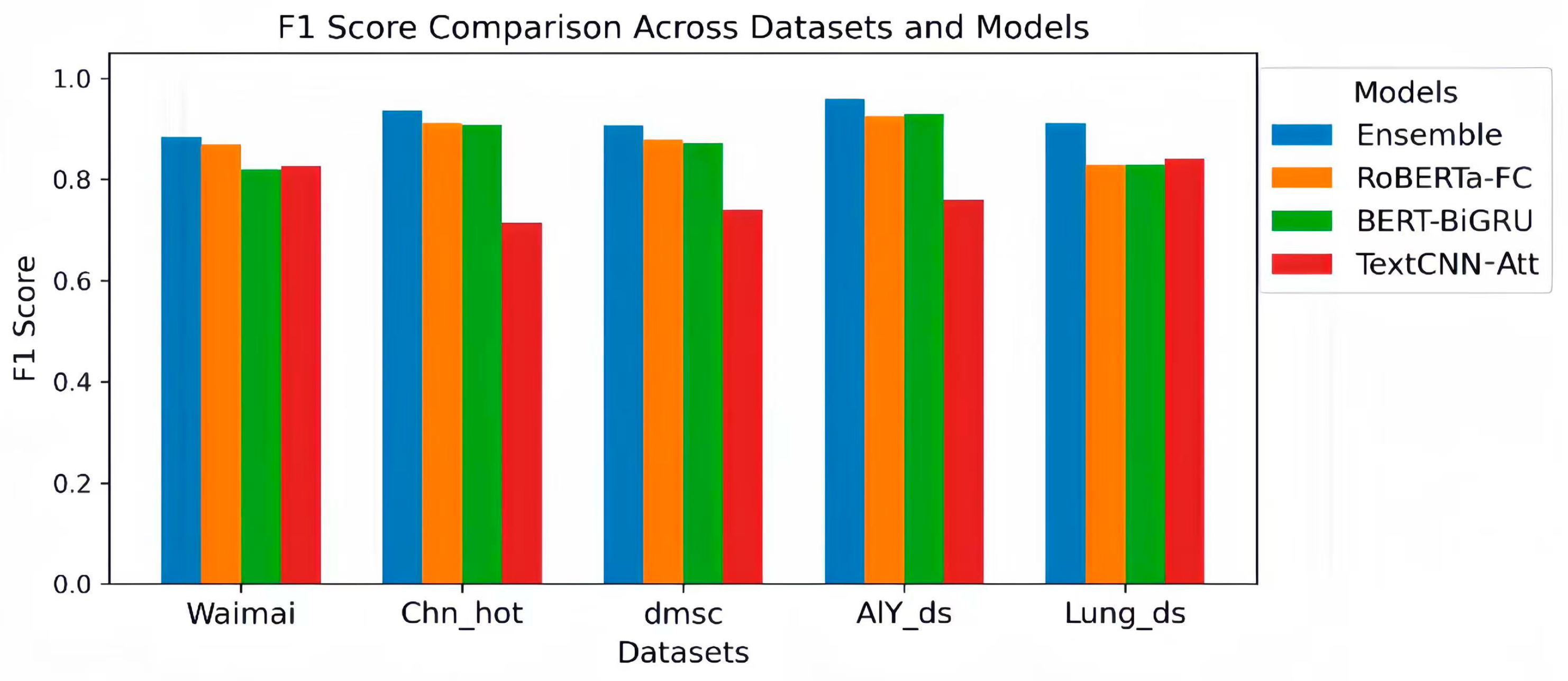 Specifically, on the Waimai dataset, the ensemble achieved an F1 Score of 0.8844, an improvement of approximately 1.48% over the top-performing single model, RoBERTa-FC, which achieved a score of 0.8696. On the Chn_hot dataset, the ensemble achieved an F1 Score of 0.9353, a 2.36% improvement over RoBERTa-FC’s score of 0.9117 and far exceeding TextCNN-Att’s score of 0.7135, demonstrating the effectiveness of ensemble strategies in suppressing the negative effects of weak models. On the disc dataset, the ensemble achieved an F1 Score of 0.9069, surpassing both RoBERTa-FC and BERT-BiGRU, further demonstrating its robustness to diverse text distributions. On the AlY_ds dataset, the ensemble’s F1 Score reached 0.9590, significantly exceeding the top single-model BERT-BiGRU’s score of 0.9298. This demonstrates that even with complex datasets, ensemble models can leverage the complementary strengths of multiple models to improve the overall prediction accuracy. Even on datasets like Lung_ds, which have a smaller sample size or uneven class distribution, the ensemble achieved an F1 Score of 0.9115, a 7–8% improvement compared to the individual models’ scores, which fluctuated between 0.8281 and 0.8413. This demonstrates that ensemble strategies can effectively mitigate the overfitting problem of individual models on small or imbalanced datasets.