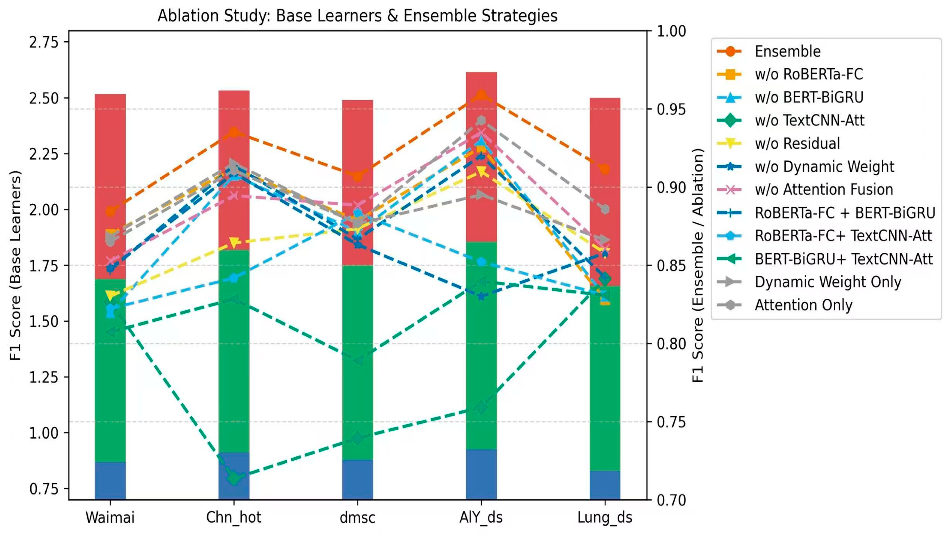 Independent effects of dynamic weight and attention mechanism: To further distinguish the effects of the two mechanisms, the “Dynamic Weight Only” and “Attention Only” experiments were added: Dynamic Weight Only: Attention Fusion was removed, and only the temperature parameter was retained for dynamic weighting. The results showed that high F1 (0.8684, 0.9151, 0.8765, 0.8661) was maintained on the Waimai, Chn_hot, dmsc, and Lung_ds datasets, indicating that dynamic weighting can effectively adjust the weights of each base learner and has a suppressive effect on the interference of weak classifiers. However, the F1 on the AlY_ds dataset was 0.8950, slightly lower than Attention Only (0.9426), suggesting that dynamic weighting alone is not enough to fully exploit local complementary information on large-scale datasets with fully complementary features. Attention Only: Dynamic weighting was removed, and only Attention Fusion was retained. The results show that the F1 Scores on the AlY_ds and Lung_ds datasets are 0.9426 and 0.8858, respectively, both exceeding those of the Dynamic Weight Only approach. This demonstrates that the attention mechanism can enhance the local complementarity of feature fusion, improving the ability to model complex semantic structures or sentiment patterns in long texts. However, on the Waimai, Chn_hot, and dmsc datasets, the F1 Scores are 0.8651, 0.9106, and 0.8769, respectively, slightly lower than those of the Dynamic Weight Only approach. This suggests that attention alone is insufficient to ensure robustness when noise levels are high or weak classifiers are interfering.