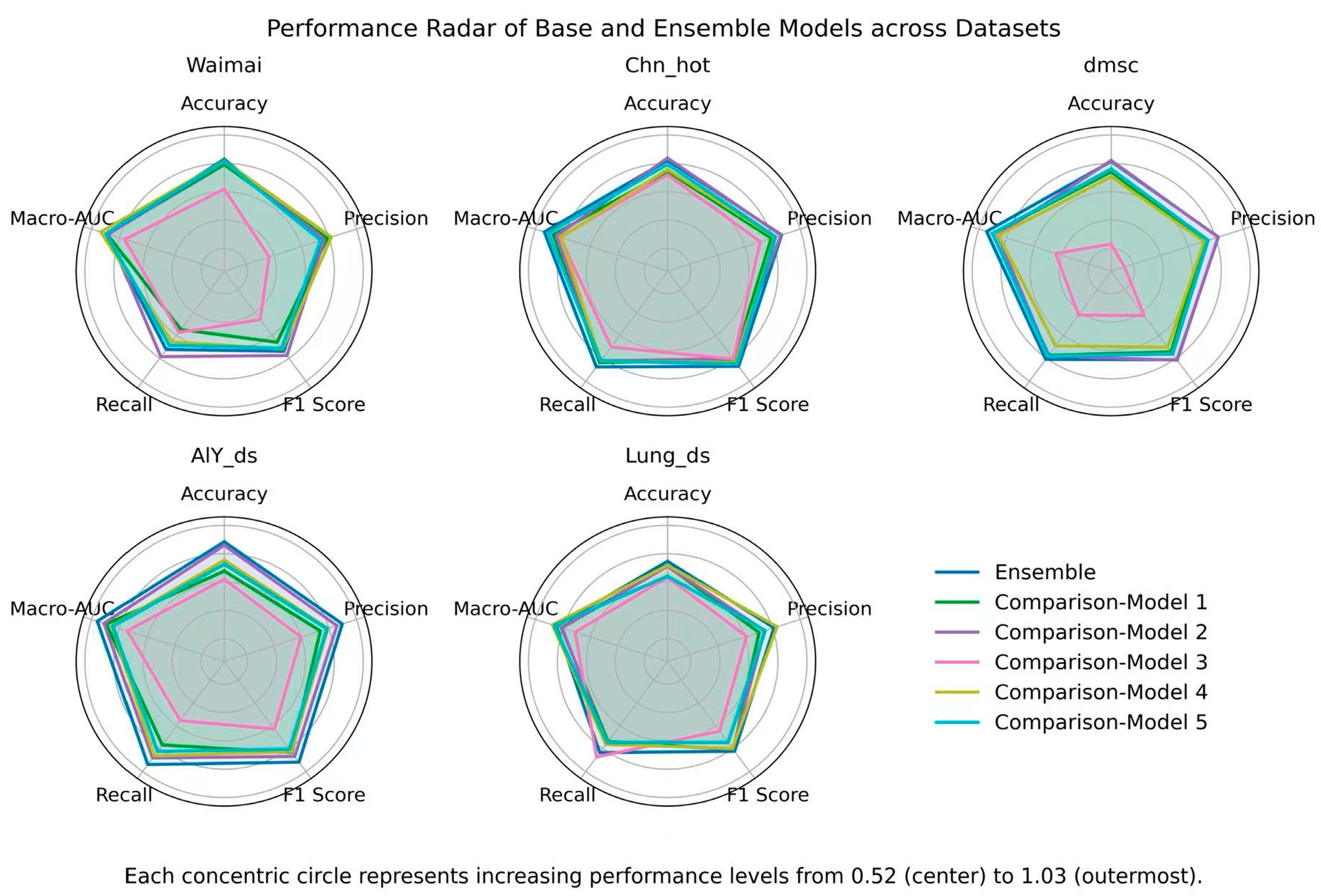 In terms of overall performance, the ensemble model demonstrated high robustness and generalization across the five datasets. Its strengths are evident not only in F1 Score but also in the balance of multiple metrics, including Accuracy, Precision, Recall, and Macro-AUC.