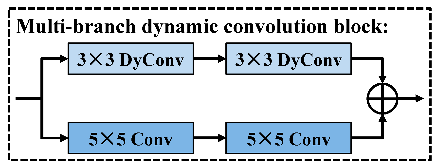 - The multi-branch dynamic convolution block is introduced, equipped with dynamic perception capabilities and powerful multi-scale feature extraction. This adaptive module is designed to selectively respond to varying spatial patterns and object scales by dynamically adjusting convolutional kernels.