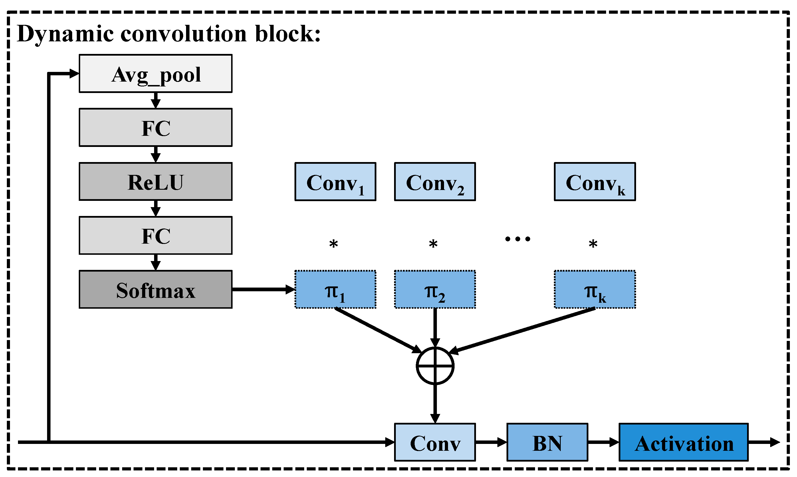 - Chen, Y.; Dai, X.; Liu, M.; Chen, D.; Yuan, L.; Liu, Z. Dynamic convolution: Attention over convolution kernels. In Proceedings of the IEEE/CVF Conference on Computer Vision and Pattern Recognition, Seattle, WA, USA, 13–19 June 2020; pp. 11030–11039. [Google Scholar]