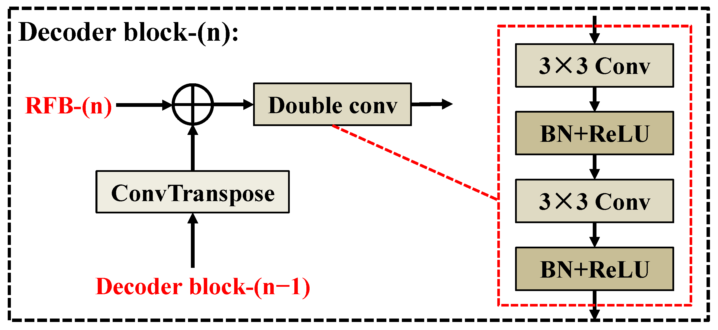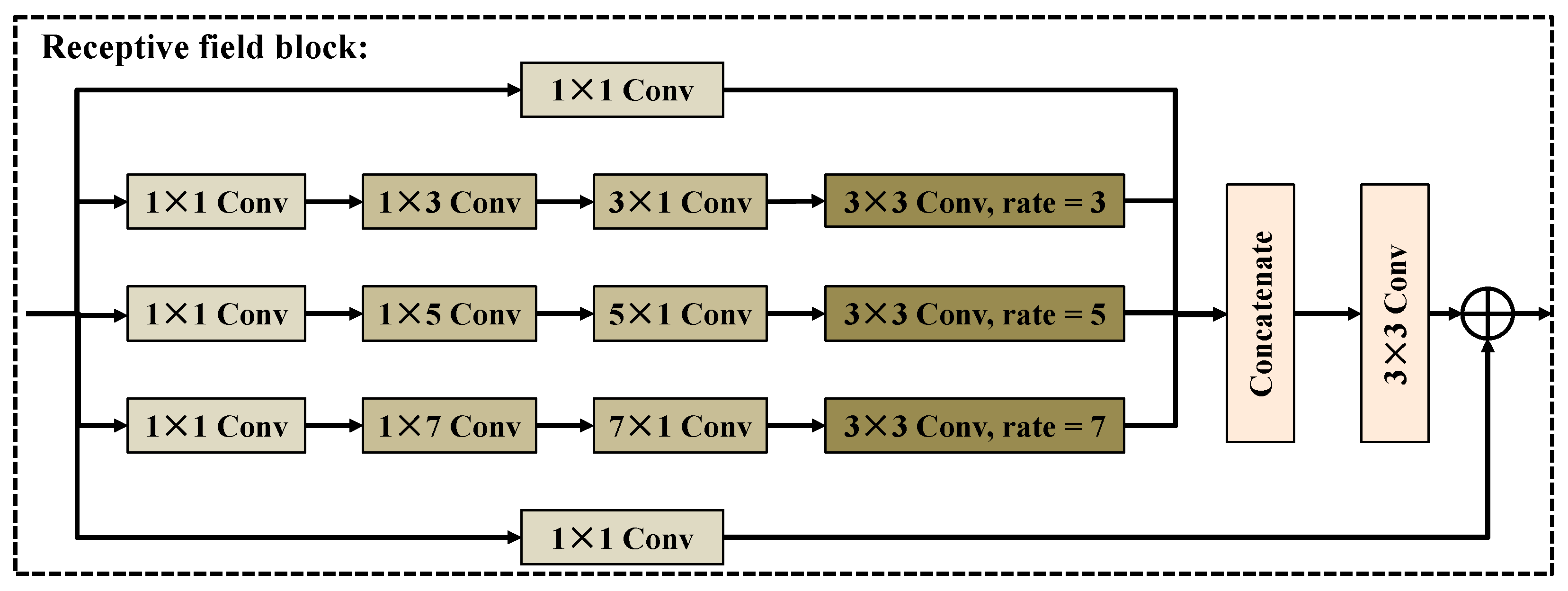 - The receptive field block is embedded into the skip connection path to enhance the preservation and transfer of spatially informative features from the encoder to the decoder. This module enriches the context flow in different network stages and makes the depiction of the target area clearer.