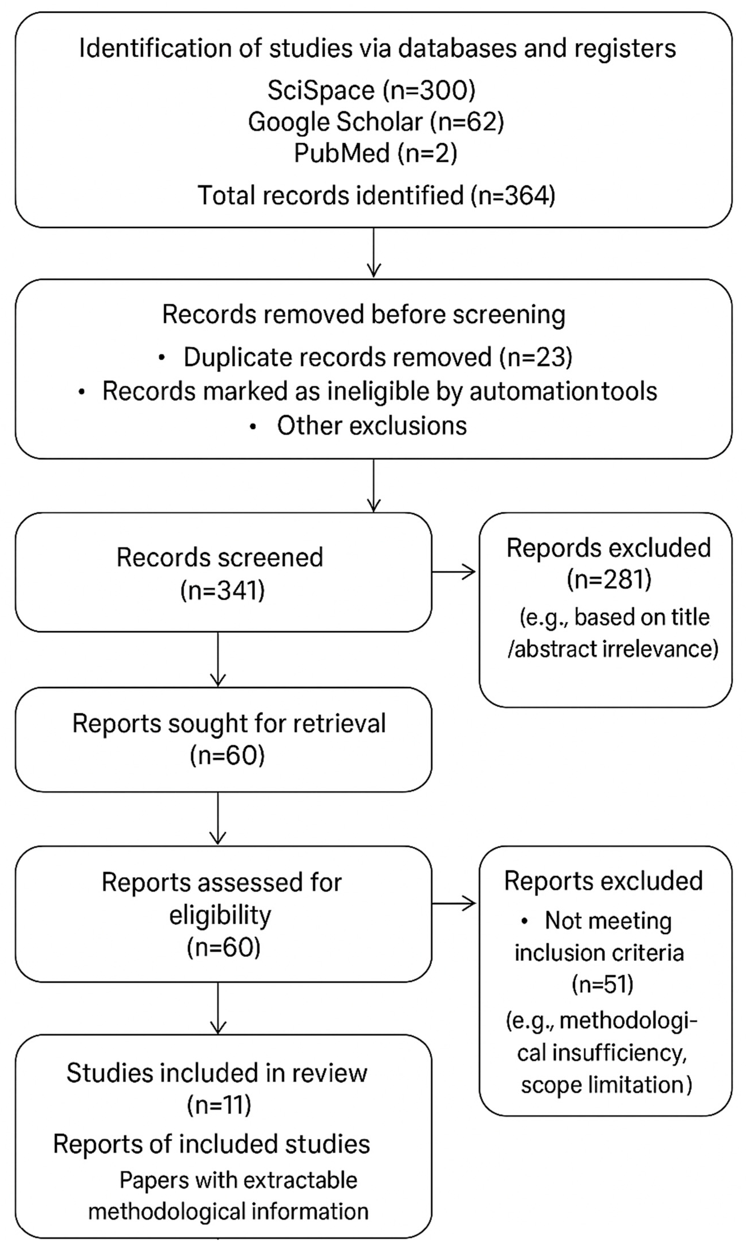 The systematic search across three major databases yielded a total of 364 records. After removing duplicates and applying inclusion/exclusion criteria through title and abstract screening, followed by full-text assessment, a final set of 11 studies was included for comprehensive analysis. PRISMA flow diagram is included in