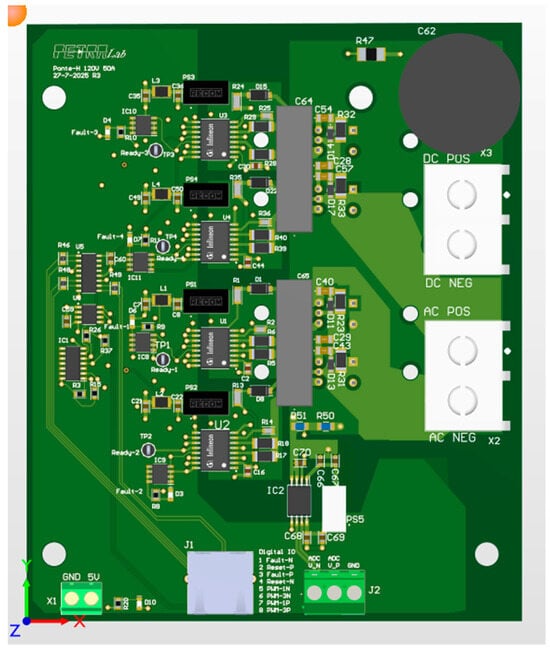 All the tests were conducted on one leg; however, the design of the two legs is identical. In particular, each leg has its own film capacitor and SMD capacitor, which are as close as possible to the MOSFETs. For this reason, the results obtained can be extended to the other leg, and the same leg design can be copied to design a three-phase system.