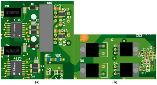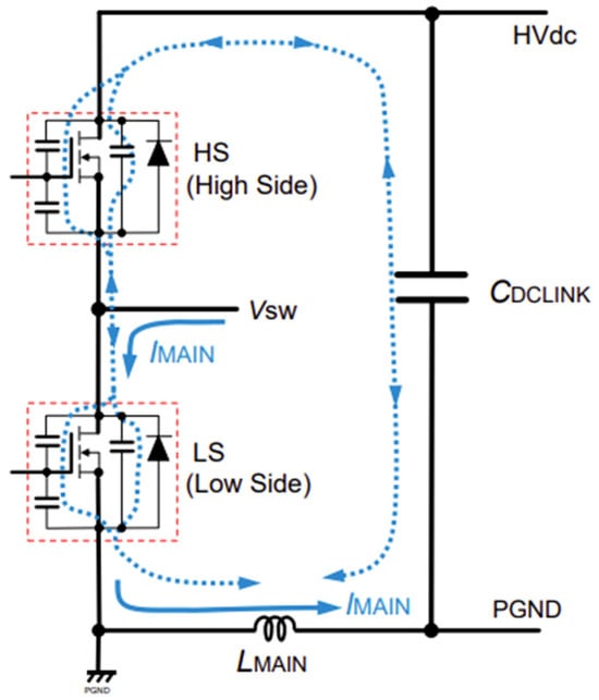 One of the main PCB design challenges is to reduce the parasitic inductance between the DC-link capacitor and the power switch device (e.g., MOSFET in the considered layout). During the switching process, even if the output current remains almost constant, it reverses direction in the DC-link capacitor. Especially with MOSFETs, the commutation is very fast, since the turn-on and turn-off times are about 50 ns, but the time during which almost all of the current transitions from one device to the other occur can last about 5 ns. As can be noticed by observing Figure 5, if the parasitic inductance between capacitor and device is significant, high overvoltage can occur. As an example, if the converter is working with the rated current of 50 A (therefore, a Δi = 50 A), a parasitic inductance of just 20 nH can cause an overvoltage during switching of up to 100 V, as shown in Equation (1), where VDSsurge−VDC is the overvoltage caused by parasitic inductance, Lpar is the parasitic inductance, Δi is the current variation during switching, and Δt is the switching duration. Please note that if a 100 V overvoltage occurs when the converter is supplied with the rated voltage of 120 V, the total voltage on the device is 220 V and the device will fail.