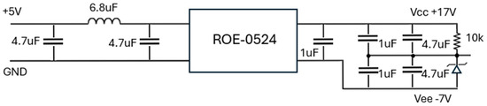 The isolated gate unit in Figure 4 is based on the isolated DC-DC converter ROE-0524 by RECOM. The ROE-0524 manufacturer does not recommend specific capacitor values for that specific DC-DC converter; however, it recommends a 10 μF capacitor on the input side of the ROE-0505 [38]. Since ROE-0524 and ROE-0505 have the same rated input current, it was chosen to use the same input capacitance. Since in the proposed converter a CLC configuration is used on the input side, two 4.7 μF capacitors were chosen so that the sum of the two capacitors is about the capacitance value suggested by RECOM. Regarding the output capacitor, since the output current is approximately 5/24 of the input current, the output capacitor was scaled based on the current value, and a 1 μF capacitor was chosen. Since a +17 V and −7 voltage supply with respect to the MOSFET source are necessary, a voltage divider is implemented, exploiting a 7 V Zener. Two couples of 1 μF and 4.7 μF capacitors are connected in parallel. The parallel connection of capacitors with different capacitance values is a standard practice to reduce the equivalent parasitic resistance.