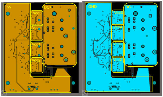 The DC+ and DC− planes can be clearly seen in the inner layers in Figure 6, whereas the two AC connections (AC+ and AC−) are highlighted in Figure 7, where the top and bottom layers are reported. The AC connections are present in both the top and bottom layers to reduce the current flow in each layer and thus prevent overheating of the PCB. Please note that even though they are called AC+ and AC−, the converter can also operate as a DC-DC (i.e., the AC+ and AC− are the connections of the converter port, where the current can be either DC or AC).