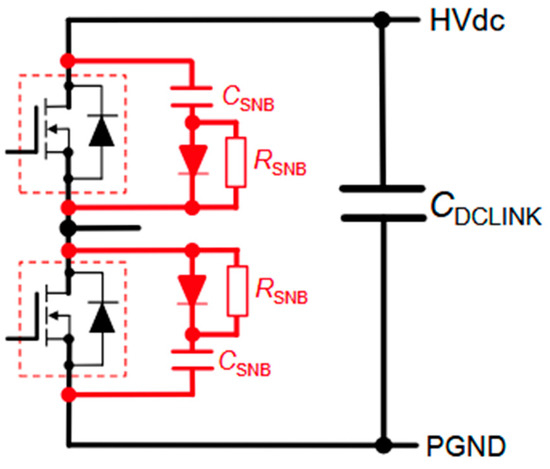 An effective way to counteract voltage spikes during switching is to introduce a capacitor snubber, as shown in Figure 8 [39].