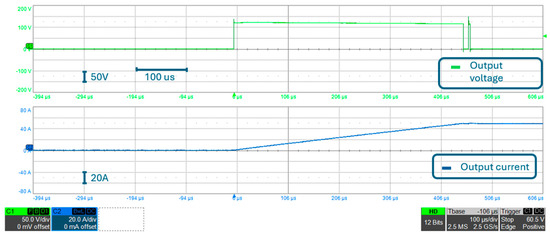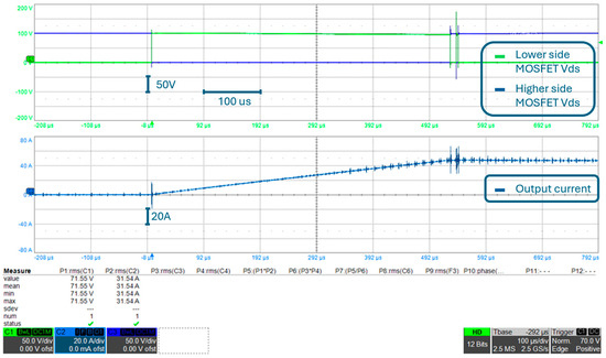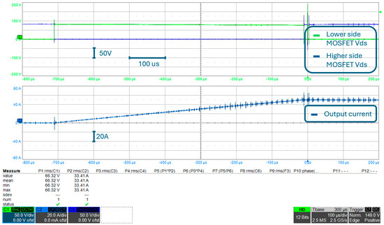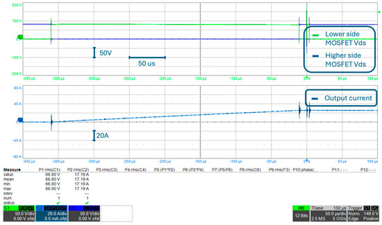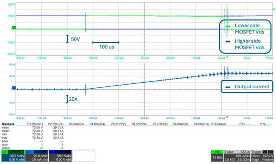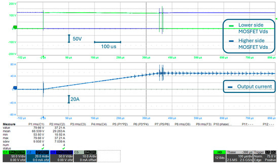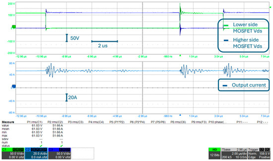 Considering that this is the final configuration of the converter, converter output voltage (i.e., the voltage between AC+ and DC−) and the converter output current are reported in Figure 24, which are measured during the double pulse test shown in Figure 22 and Figure 23. Please note that the converter output current shown in Figure 24 is measured at the same point of the circuit as the output current shown in other experimental results, according to what is shown in Figure 9. The output voltage is measured at the converter output connection and is approximately the same waveform as the lower side MOSFET VDS. As a matter of fact, if one observes Figure 9, it can be noted that, neglecting PCB parasitic inductances, converter output voltage corresponds to lower-side MOSFET VDS. Moreover, please note that, as described in Section 3.1, the double pulse test consists of an initial “pulse” (with an approximate time duration of 440 μs in this test) of the output voltage, during which the current rises to the rated value, followed by a 10 μs interval where the output voltage is zero, and a second “pulse” of 4 μs is used to evaluate the overvoltage on the device during switching at the rated current, both at turn-on and turn-off. The entire double pulse test is therefore shown in Figure 24.