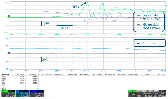 The double pulse test results are shown in Figure 11, and an enlargement is reported in Figure 12. One can note that the turn-off is without overvoltage, whereas the overvoltage occurs during turn-on, and the effect is higher when the current is higher. From the enlargement, despite a DC-voltage of only 80 V and a current of only 25 A, the Vds voltage on the lower switch reaches 199 V (please note that the overvoltage peak was evaluated with the cursor of the oscilloscope). This behavior is clearly unacceptable, and counteractions are needed.