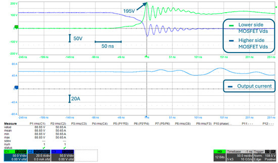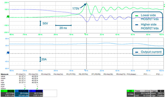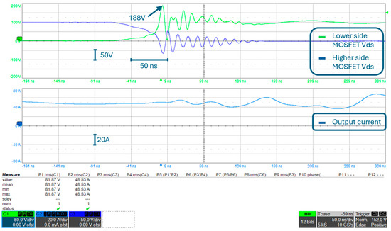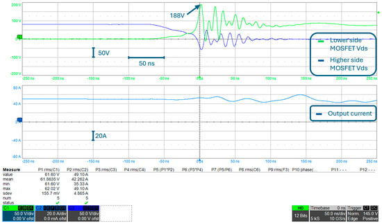 The first improvement that was tested was the addition of a 250 V-40 A Schottky diode in parallel to each MOSFET. The turn-on of the diode is faster than the turn-on of the MOSFET body diode, and therefore, the overvoltage during switching can be reduced to 188 V, even with the output current increased to the rated value (i.e., 50 A), as can be seen in Figure 13 and Figure 14.