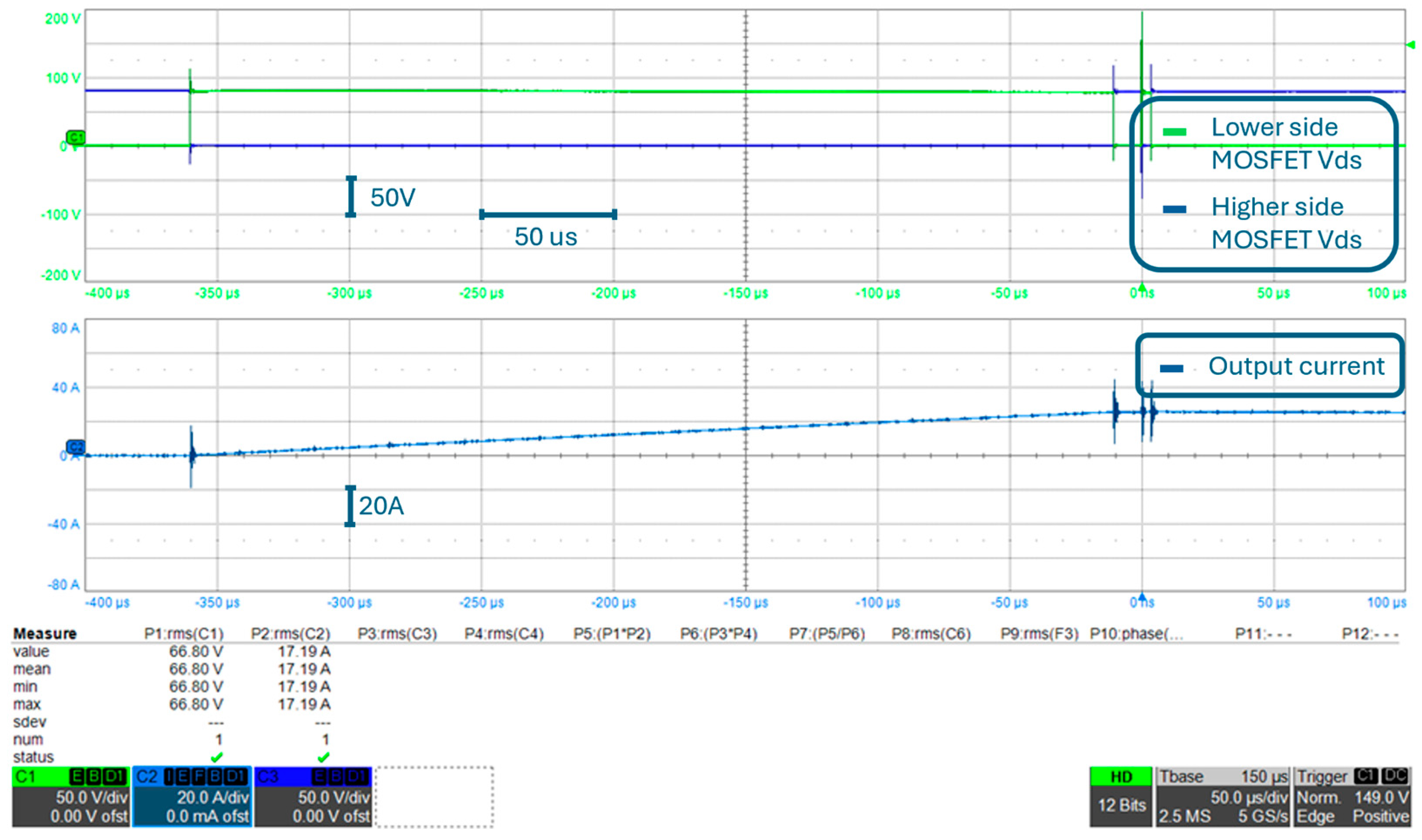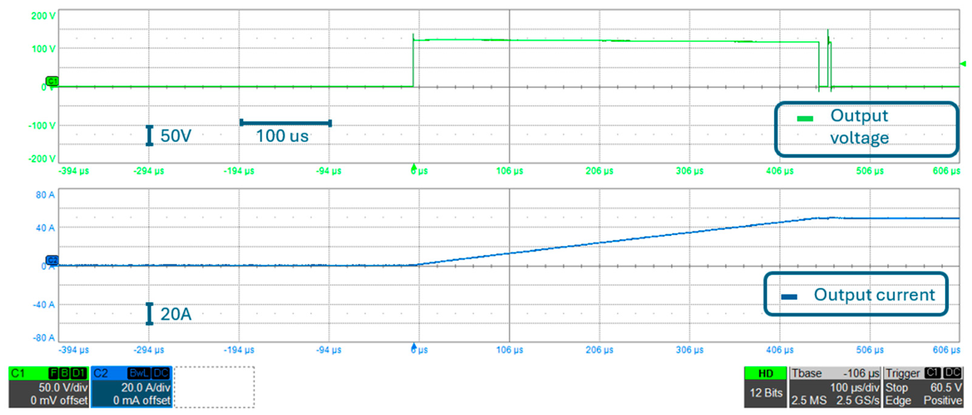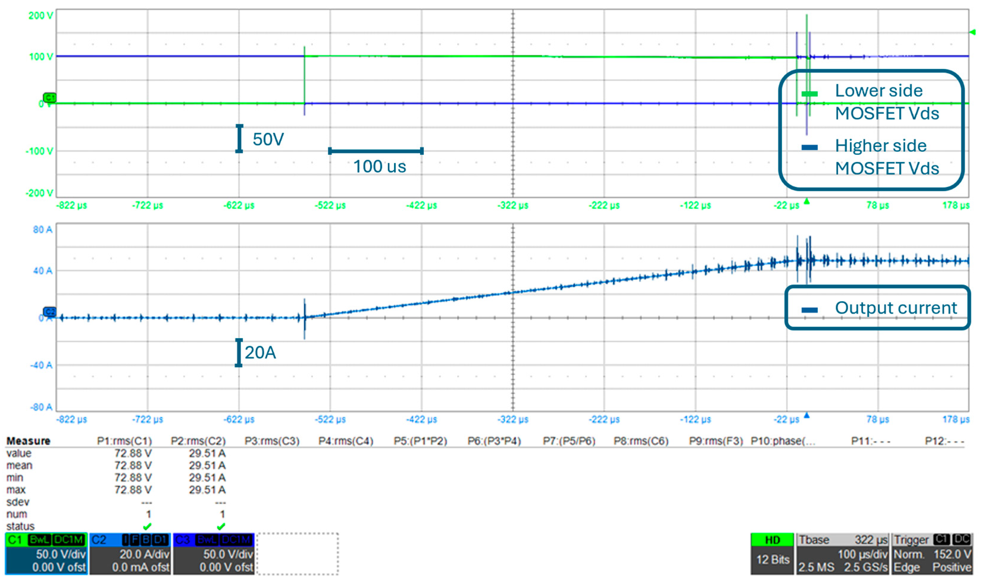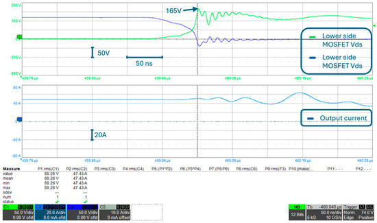 Double pulse was performed at first on the reference case, i.e., the PCB, without any countermeasure for overvoltage reduction. With a reduced DC input voltage (80 V), tests were carried out with increasing output current. The test was stopped at 25 A, since voltage during switching almost reached the MOSFET rated voltage. Subsequently, 250 V-40 A Schottky diodes were soldered in parallel to each MOSFET. In this configuration, it was possible to increase the current to the rated value (50 A) with a reduced overvoltage of 188 V. After that, a 0.1 μF SMD ceramic capacitor was soldered significantly close to the MOSFET pin. Please note that from an electrical point of view, this capacitor is in parallel to the DC-input capacitor. In this configuration, it was possible to reach 100 V of input voltage, obtaining the same overvoltage of 188 V. Further to this, a 1 nF-5.1 Ω RC snubber was added in parallel to each MOSFET; in this configuration, it was possible to reach the converter rated value (i.e., 120 V of input voltage and 50 A of output current), keeping the overvoltage below MOSFET rated voltage. However, the overvoltage in this configuration (i.e., 195 V), was close to the MOSFET rated voltage and, therefore, an additional diode was soldered in parallel to the snubber resistor. In this last configuration, the overvoltage peak during switching was only 165 V, which allows us to have a significant margin with respect to the device’s rated voltage.